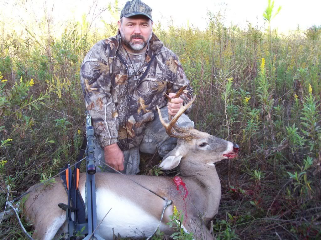 First year hunting with my exocet.Started out with an opening day doe and then last Tuesday I was hunting a new area where I had found a bunch of rubs the day before.About 7:30 looked to my hard right and saw a brown butt about 30 yards away .Saw it was a buck feeding around on some live oaks but didnt have a shot.I slowly had to turn my body and moved my xbow so I could make a left hand shot.He finally made his way to about 15 yards and started rubbing a bush.I knew if he went a few more steps he would be downwind and bust me.I was able to pick out an opening and took a shot.He highkicked and ran under my stand out into a weed field where I couldnt see but I heard a bunch of weeds breaking and didnt know if he had fell or took off again.Give him 30 minutes and got down.could find any blood so I just walked in the direction of the last noise I heard and walked right to him,he had went about 100 yards and died.Not a monster rack but about 200 lbs and not a bad buck for A GA public land buck with a broadhead.